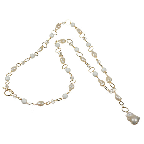 Geneva A 100cm drop, luminous throw on necklace. Comprising both large and small circles of gold, which are enhanced by 10mm white agate spheres, 10mm oval freshwater pearls and sparkling crystals. A 14-16mm lustrous, baroque...